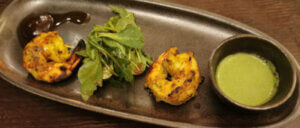 Spolu se dvěma omáčkami doprovodu – koriandrovo máslovou a tamarindovou – obdařilo jemné, hladké maso optimálně připravených krevet správnou měrou vzruchu.